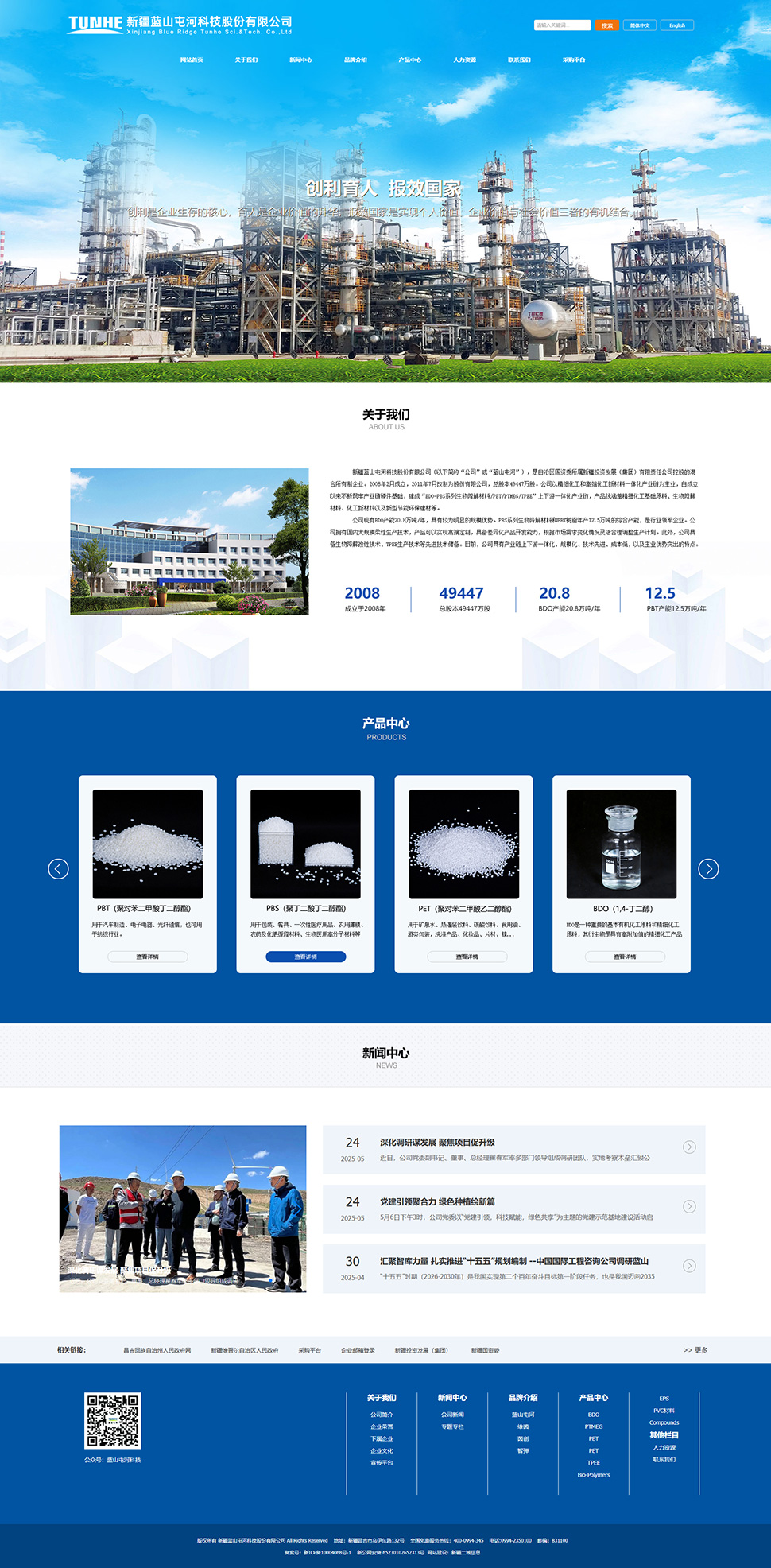 藍山屯河緊緊圍繞自治區“發揮六大優勢資源、打造十大產業集群”戰略部署,初步建成“昌吉生物新材料科技產業園”和“奇臺精細化工產業園”兩大產業園區,形成“BDO-PBS系列生物降解材料/PBT工程材料/PTMEG/TPEE彈性體材料”特色突出、優勢互補的一體化產業鏈,產品線涵蓋精細化工基礎原料、生物降解材料、化工新材料以及新型節能環保建材等,綜合產能過百萬噸,榮獲第六屆中國工業大獎(表彰獎)、國家質量獎(提名獎)、全國國企改革標桿級“雙百企業”等多項殊榮;旗下四家核心子公司分別被認定為國家制造業單項冠軍企業、國家專精特新“小巨人”企業。